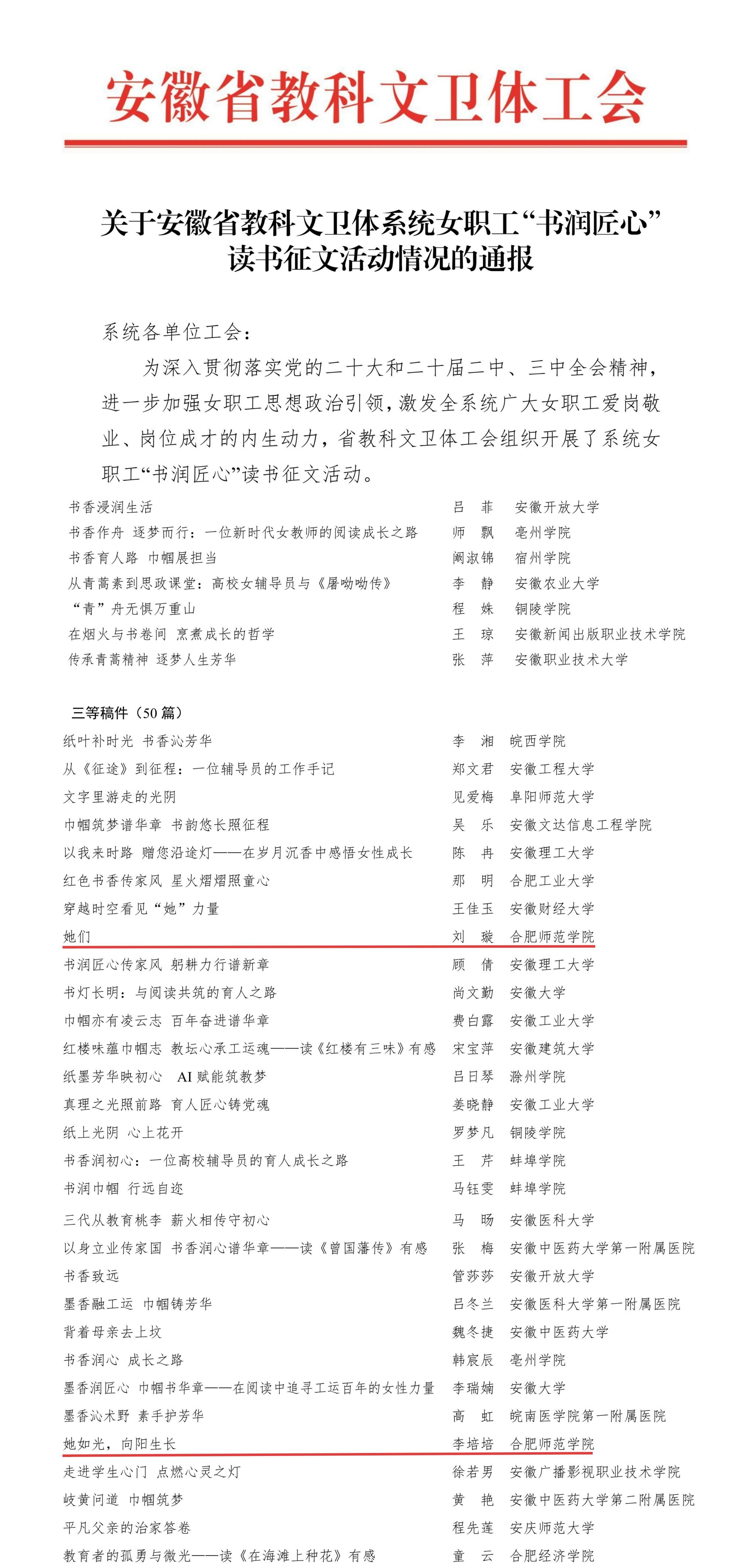 自活动启动以来,校工会广泛宣传,积极动员女职工参与,并选送了4篇优秀征文作品。近日,经专家评审,我校女职工刘璇、李培培的征文作品荣获三等奖。